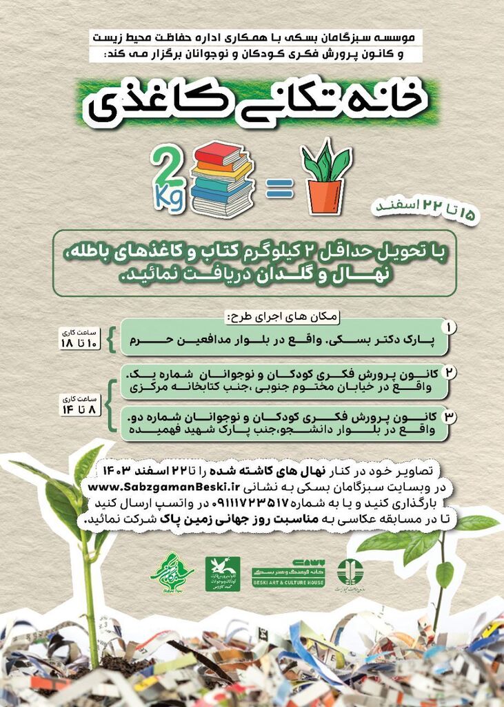وی ادامه داد: هر کودک و نوجوانی که حداقل دو کیلوگرم کتاب و کاغذهای باطله خود را به کانون پرورش فکری این شهرستان تحویل دهند یک نهال و گلدان تحویل خواهند گرفت.