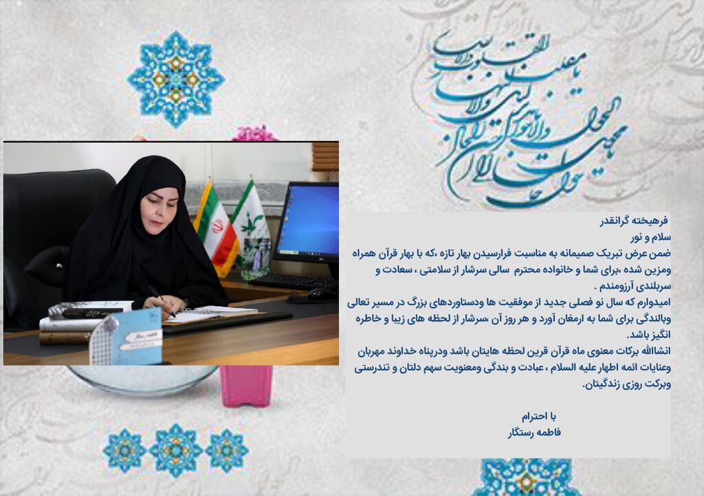 ضمن عرض تبریک صمیمانه به مناسبت فرارسیدن بهار تازه ،که با بهار قرآن همراه ومزین شده ،برای شما و خانواده محترم سالی سرشار از سلامتی ، سعادت و سربلندی آرزومندم .