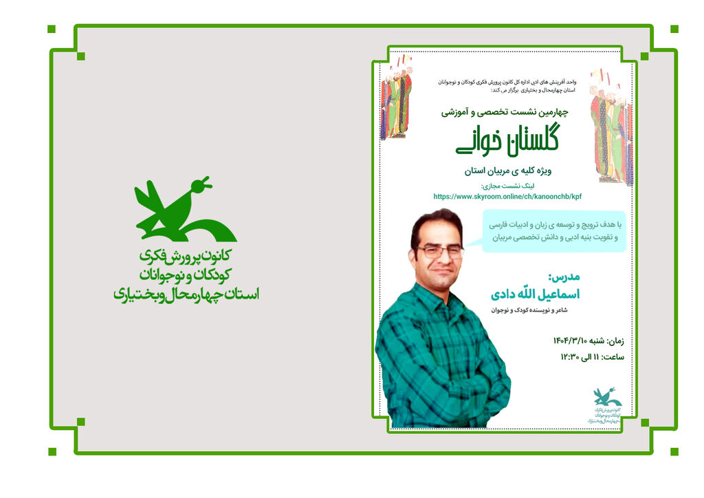 به گزارش خبرگزاری کودک پرس، استان چهارمحال و بختیاری، چهارمین نشست تخصصی گلستانخوانی از سوی واحد آفرینشهای ادبی روز شنبه ۱۰ خرداد ۱۴۰۴ با حضور مدیر کل استان، کارشناسان ادبی و تمامی مربیان فرهنگی، ادبی و هنری در فضای اسکای روم برگزار شد.