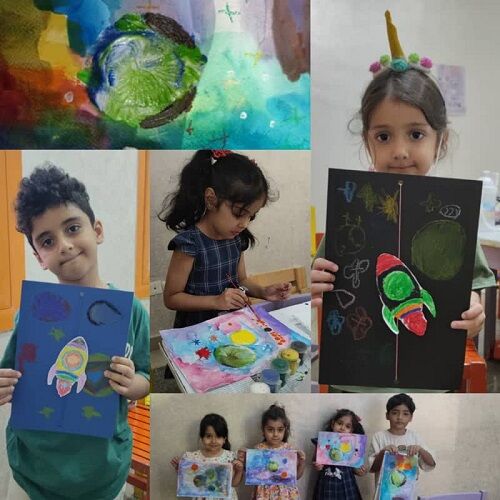 در این کارگاه اعضای کودک ۴ تا ۶ سال با تکنیک کلاژ و با آبرنگ و پاستل نقاشی های خود را با موضوع سفر به فضا خلق کردند.