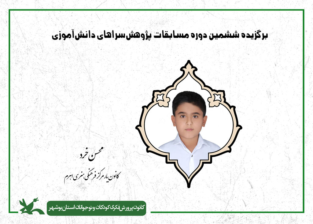 به گزارش خبرگزاری کودک پرس، استان بوشهر، این موفقیت در حوزه نانوفناوری و در محور «مدرس کوچک» به دست آمد. اثر ارائهشده از سوی این عضو فعال کانون، ساخت یک کلیپ آموزشی با موضوع نانوفناوری در ایران بود که با رویکردی خلاقانه و آموزشی توانست نظر داوران را جلب کند.