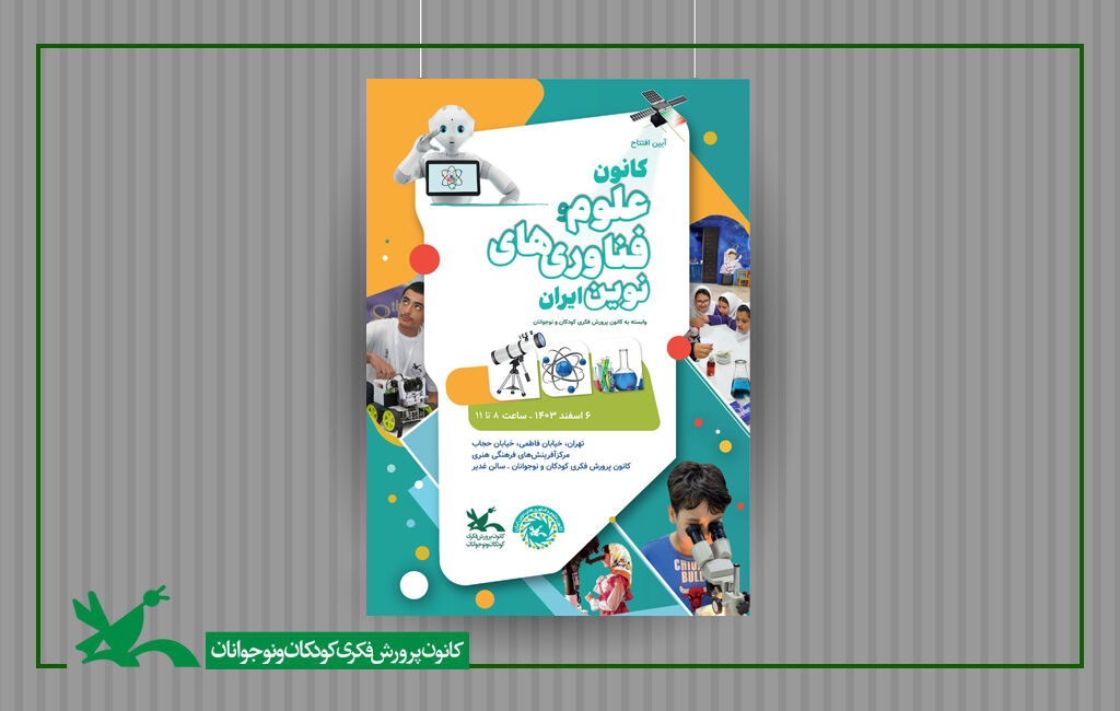 آیین گشایش کانون علوم و فناوریهای نوین ایران ساعت ۸ تا ۱۱ صبح روز دوشنبه ۶ اسفند ۱۴۰۳ در سالن شهید بهنام محمدی مرکز آفرینشهای فرهنگی هنری کانون پرورش فکری کودکان و نوجوانان واقع در خیابان حجاب تهران برگزار میشود.
