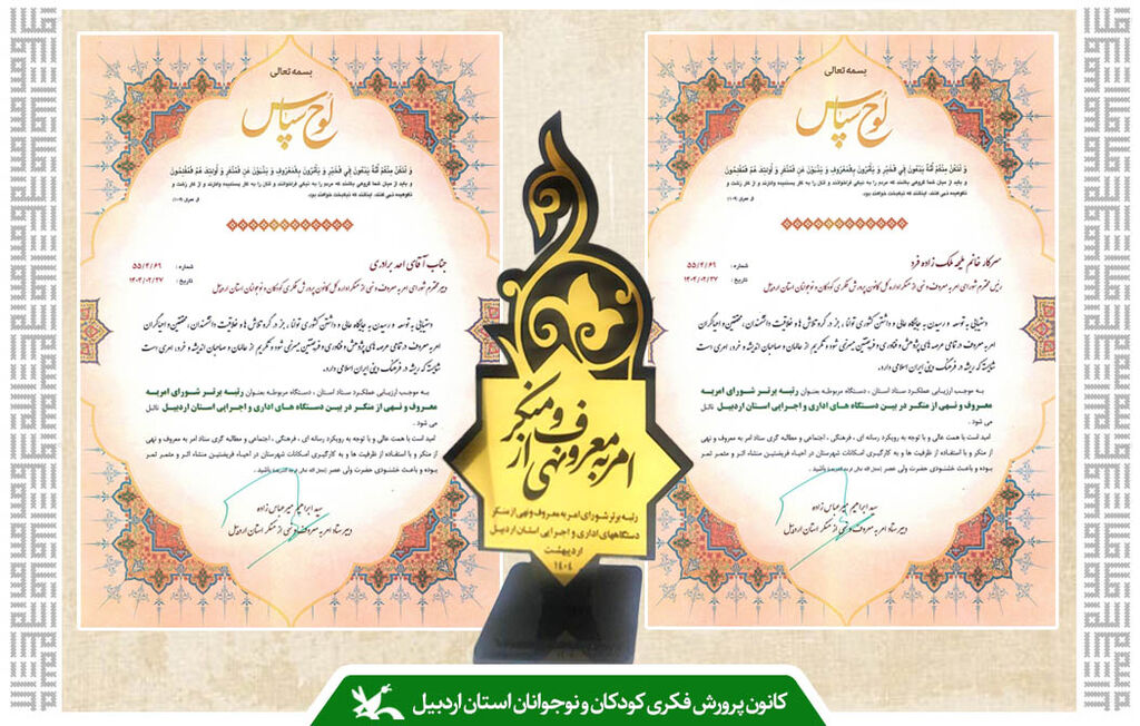 به گزارش خبرگزاری کودک پرس، استان اردبیل، در مراسمی که به همین مناسبت روز دوشنبه ۲۹ اردیبهشتماه ۱۴۰۴ در سالن شهید رجایی استانداری اردبیل برگزار شد، ملیحه ملکزاده فرد، مدیرکل کانون استان و احد برادری دبیر شورای امربهمعروف و نهی از منکر این اداره کل، از سوی سید ابراهیم میرعباسزاده، دبیر ستاد امربهمعروف و نهی از منکر استان اردبیل، مورد تقدیر قرار گرفتند و لوح سپاسی به آنان اهدا شد.