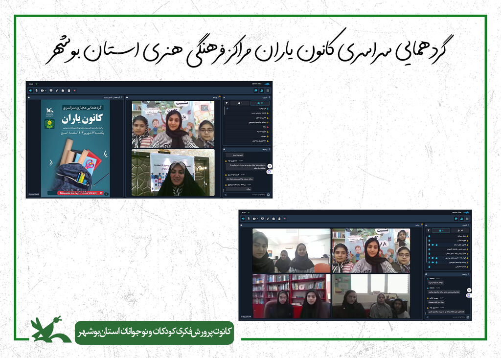 به گزارش خبرگزاری کودک پرس، استان بوشهر، در این نشست که برگزاری آن را کانون یاران به عهده داشتند، اعضای کانون یار ضمن معرفی فعالیتها و بیان تجربیات خود در مراکز، به اجرای برنامههای متنوعی از جمله شعرخوانی، موسیقی و ارائه نمونههایی از دستاوردهای فرهنگی و هنری پرداختند.