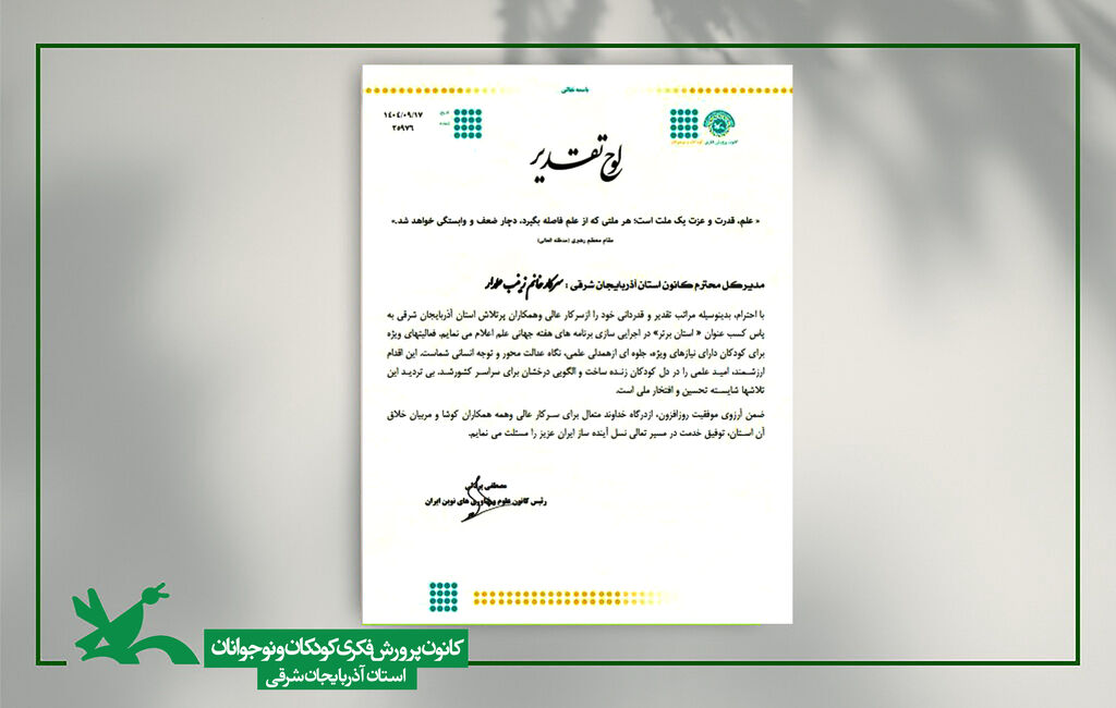 کسب این عنوان، بیانگر تعهد و نقش اثرگذار کانون پرورش فکری کودکان و نوجوانان استان آذربایجان شرقی در ترویج علم فراگیر و توجه ویژه به مسئولیتهای اجتماعی در حوزه کودک و نوجوان است.