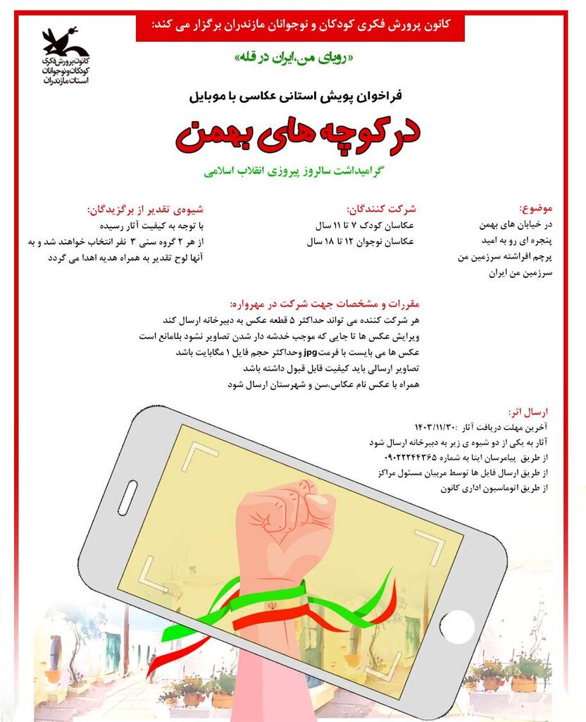 کانون پرورش فکری کودکان و نوجوانان مازندران پویش استانی عکاسی با موبایل در کوچههای بهمن را به مناسبت گرامیداشت سالروز پیروزی انقلاب اسلامی برگزار کرد. این رویداد هنری که با محوریت موضوعاتی از جمله “در خیابانهای بهمن”، “پرچم ایران”، “برپایی مراسمهای دهه فجر” و “نمادهای انقلاب اسلامی” طراحی شده بود، شاهد حضور پرشور کودکان و نوجوانان بود.
