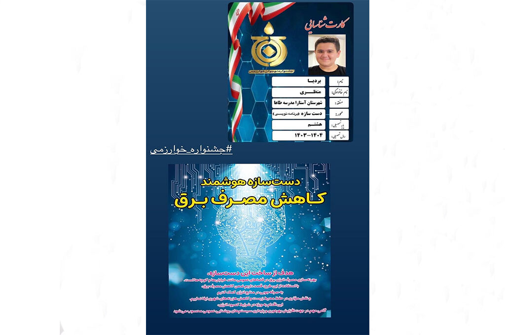 روند ارایه و انتخاب طرح خلاقانه «کاهنده مصرف برق» این عضو کانون پرورش فکری کودکان و نوجوانان استان گیلان تا ۶ مرداد۱۴۰۴ ادامهیافت و با کسب عنوان نخست بخش منطقهای و مقام دوم استانی جشنواره علمی خوارزمی از سوی بردیا منظری همراهشد.